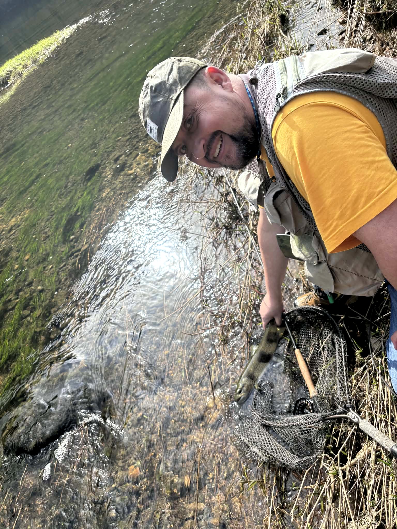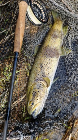 Je me suis donc concentré à trouver des truites sur le fond pour les tenter en nymphe à vue. J'ai pu en attaquer quatre dans de bonnes conditions pour en prendre deux. Une s'est décrochée à l'épuisette et l'autre est entrée dedans. Une pêche simple avec une pointe en 15 centièmes et une cuivre sur hameçon de 16. Du grand classique.