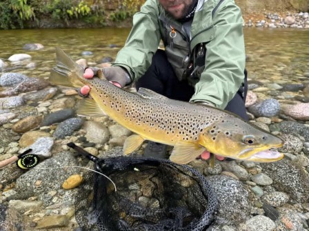 Et puis, avant-hier, j'ai eu des nouvelles de Mathias. Il est en plein dans son séjour au pays du grand nuage blanc. Quelle joie de lire son retour. Quel régal de découvrir les photos qu'il m'a envoyé. Des truites magnifiques capturées avec les nymphes fabriquées de mes mains. Il n'a pas eu l'occasion de beaucoup pêcher en sèche, mais pour les nymphes, ça fonctionne fort !