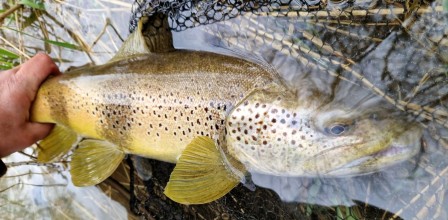 Alors que j'allais abandonner moi aussi, il m'a semblé voir une barre d'un teint plus sombre que le fond dans une veine d'eau courante mais peu profonde. J'ai bien mis 5 minutes pour avoir la certitude que c'était un poisson. La voilà ma truite ! Le plus dur était fait. Y croire en cherchant l'impossible. La visibilité était vraiment médiocre mais j'ai bien vu le mouvement de cette tête au passage de ma cuivre. Un ferrage appuyé avec une pointe de gros diamètre. Un combat court et intense. Mais surtout un petit cri de joie pour la première de l'année ! Elle était pas donnée celle-ci ! Surtout avec ce niveau, cette eau laiteuse et cette bise glaciale. Cela donne encore plus de valeur à ce poisson. 40 ans que je pêche, et ce poisson, j'avais l'impression que c'était le premier ! Cette merveilleuse truite sauvage m'a procuré une immense joie !