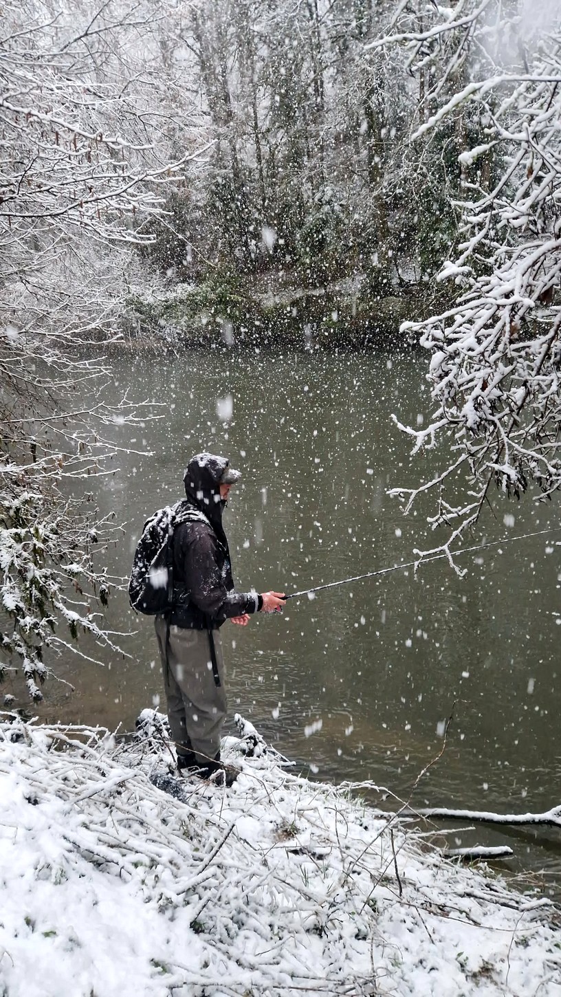Il fallait être plutôt motivé samedi en partant dans la nuit pour rejoindre la rivière. Des flocons de neige tombaient avec une densité peu commune. À cela il fallait ajouter des trombes d'eau tombées dans la nuit avec un vent dont les rafales ont dépassé les 80 km/h. La neige nous a dissuadé de descendre jusqu'au parking avec les voitures. Tout le monde à pied ce samedi matin ! Avec la pluie de la nuit, la rivière était en train de monter et de se teinter à notre arrivée. Vraiment pas engageant. Surtout en pensant à la météo de la veille !