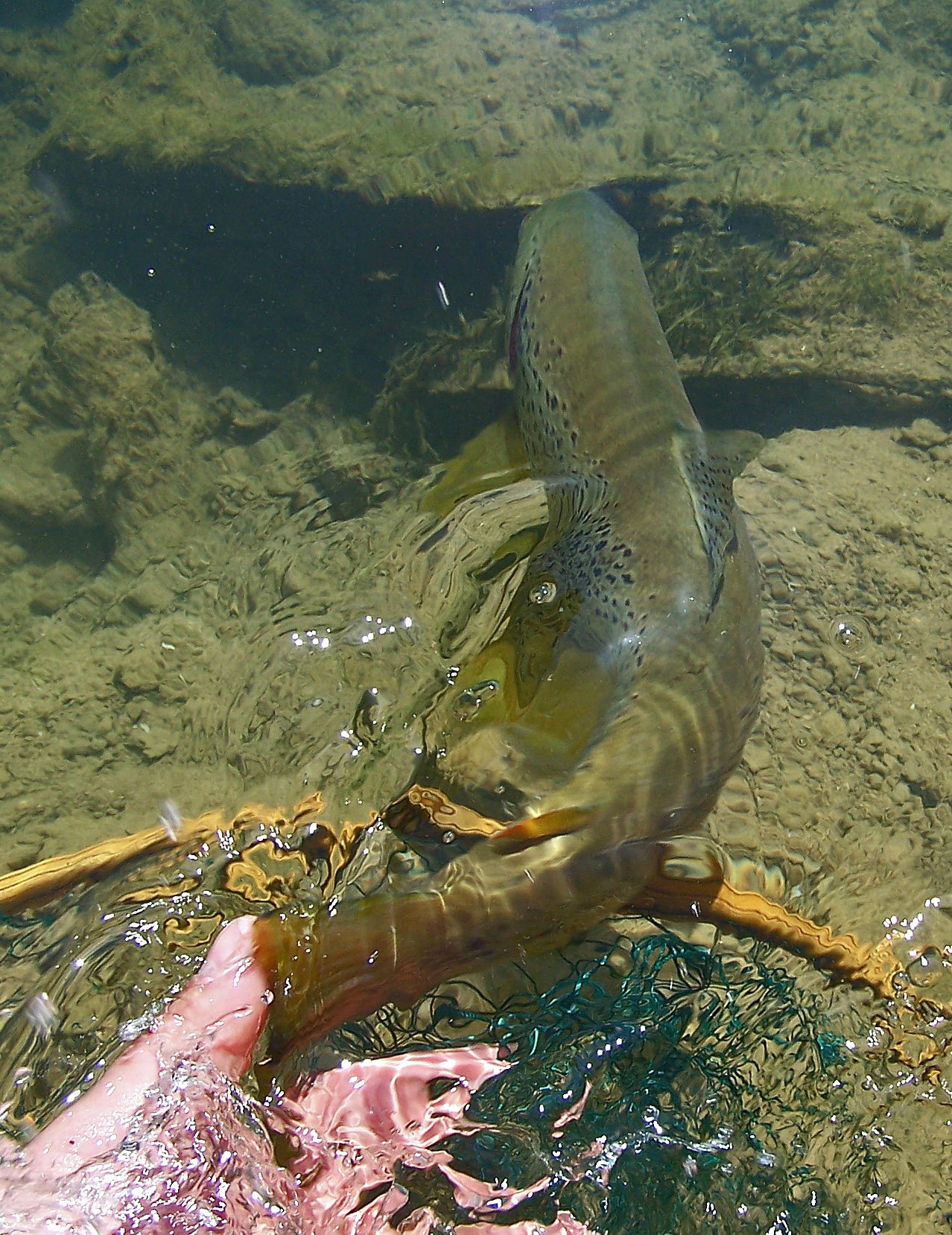 Je me suis donc concentré à trouver des truites sur le fond pour les tenter en nymphe à vue. J'ai pu en attaquer quatre dans de bonnes conditions pour en prendre deux. Une s'est décrochée à l'épuisette et l'autre est entrée dedans. Une pêche simple avec une pointe en 15 centièmes et une cuivre sur hameçon de 16. Du grand classique.